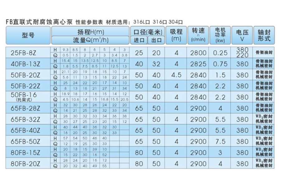 FB型耐腐蝕泵具有性能穩(wěn)定可靠,密封性能好,外觀美觀,使用檢修方便,泵體、泵蓋、葉輪、軸套等主要零部件均采用不銹鋼材料制造。FB型采用機(jī)械密封裝置,根據(jù)需要選用單端面或者雙端面機(jī)械密封,密封腔內(nèi)通入有一定壓力的水沖洗摩擦端面起冷卻作用,介質(zhì)溫度在-20℃ ~ 130℃范圍之間,流量:2-400m3/h;,揚(yáng)程:10-105m。