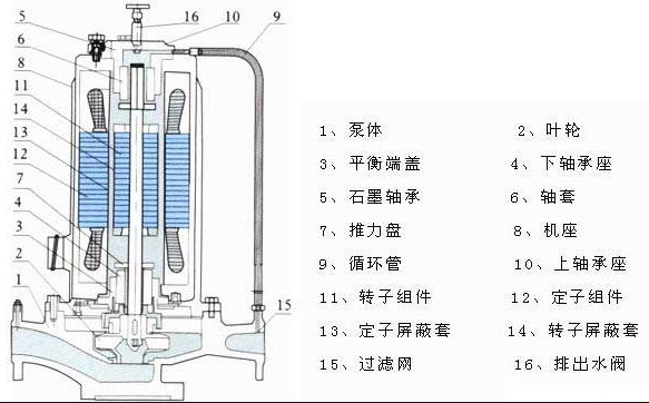 從屏蔽泵結(jié)構(gòu)圖中可以看出管道式屏蔽離心泵是由泵體、葉輪、平衡端蓋、下軸承座、石墨軸承、軸套、推力盤、機座、循環(huán)管、上軸承座、轉(zhuǎn)子組件、定子組件、定子屏蔽套、轉(zhuǎn)子屏蔽套、過濾網(wǎng)、排出水閥等組件構(gòu)成,屏蔽泵主要零部件有底板、泵體、葉輪、石墨軸承、屏蔽電機定子、屏蔽電機轉(zhuǎn)子、冷卻水管、閥門等部件構(gòu)成。