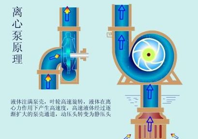 啟動前,泵殼和吸入管注滿水,然后啟動電機。泵軸驅(qū)動葉輪和水高速旋轉(zhuǎn)。水以離心的方式運動并被拋到葉輪的外緣。水通過蝸殼泵殼的流道進入泵的壓力管道。